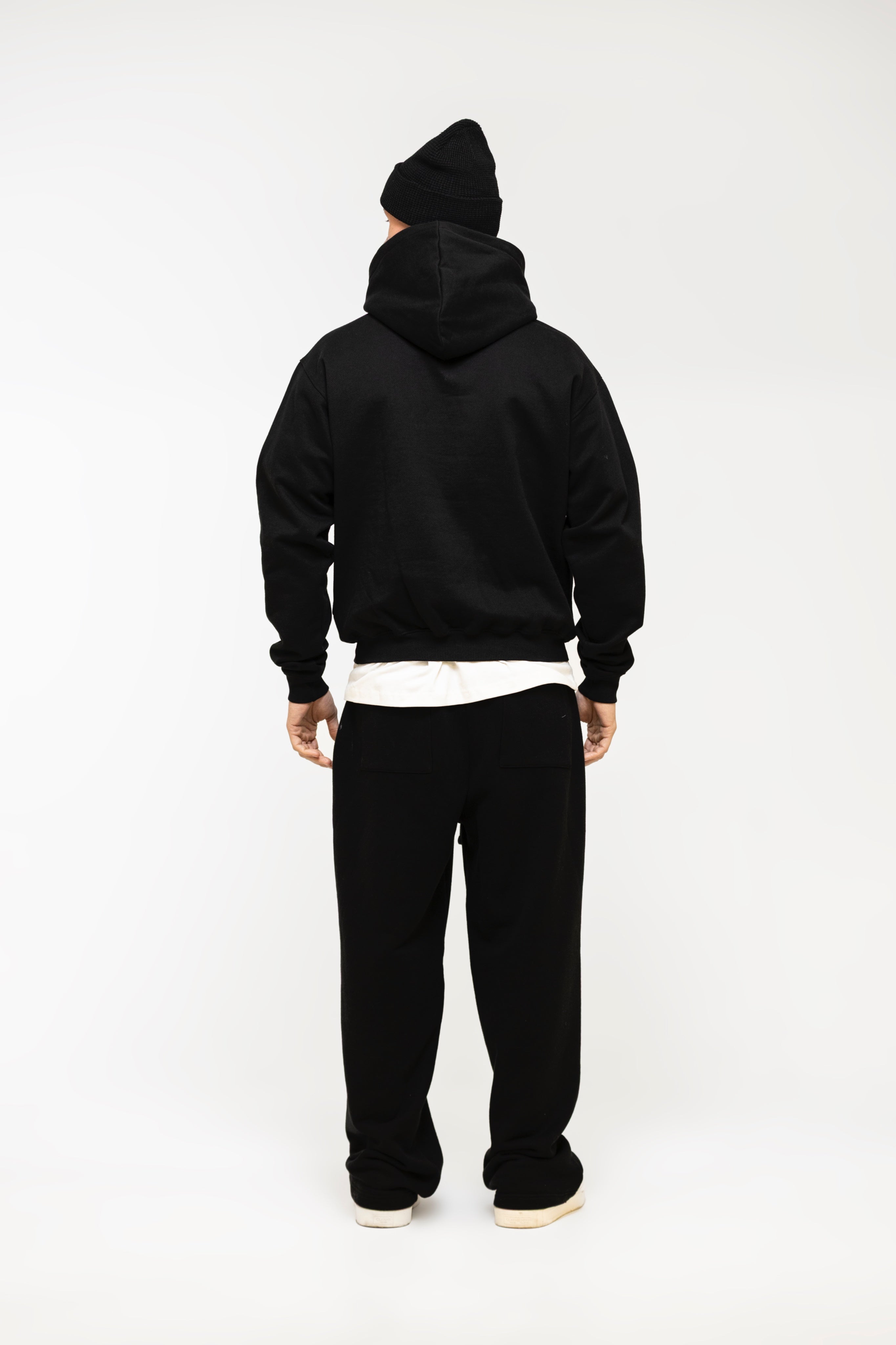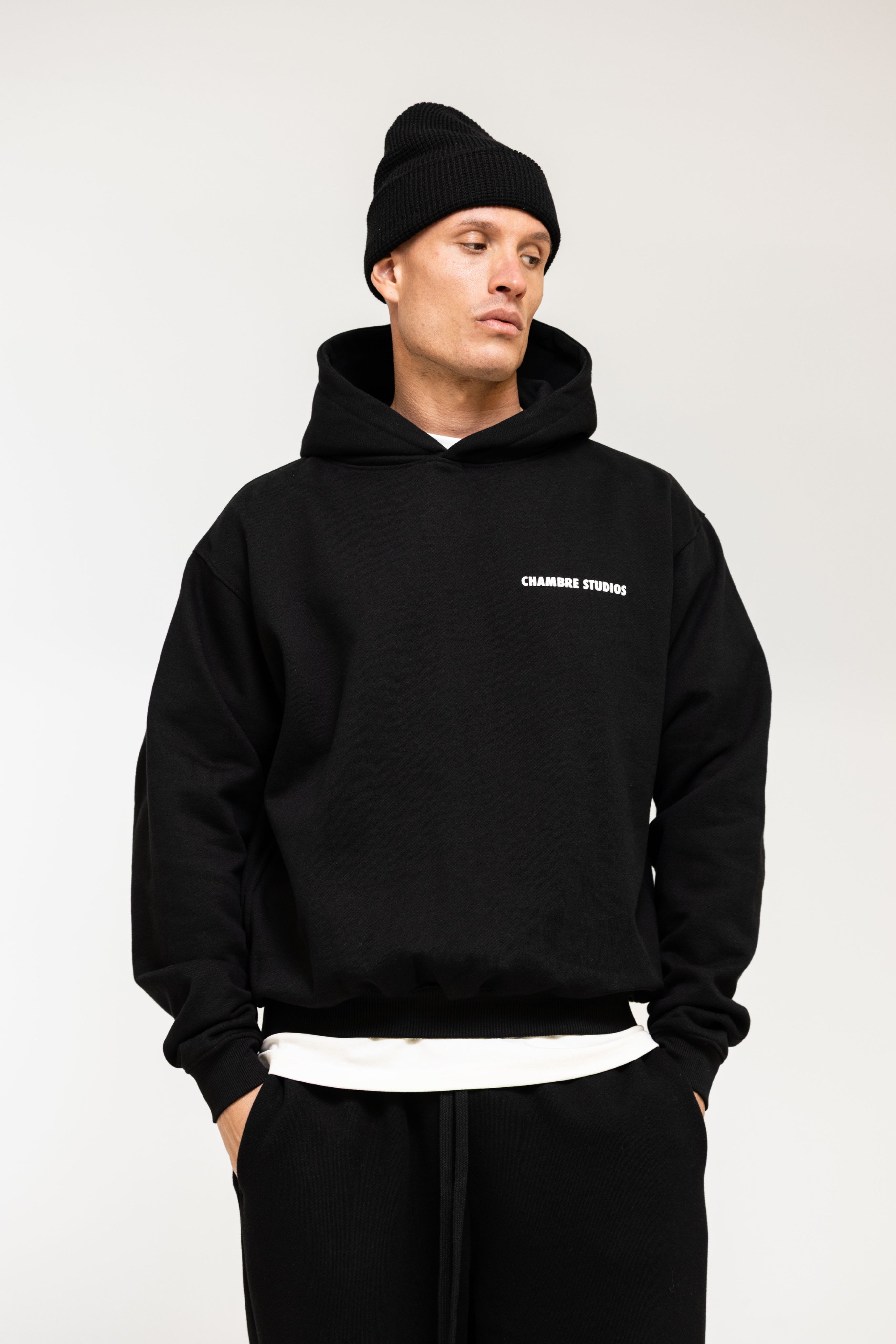 A heavyweight black hoodie featuring a high-quality double-pressed screen print logo. Soft, durable and structured for premium warmth and everyday wear.