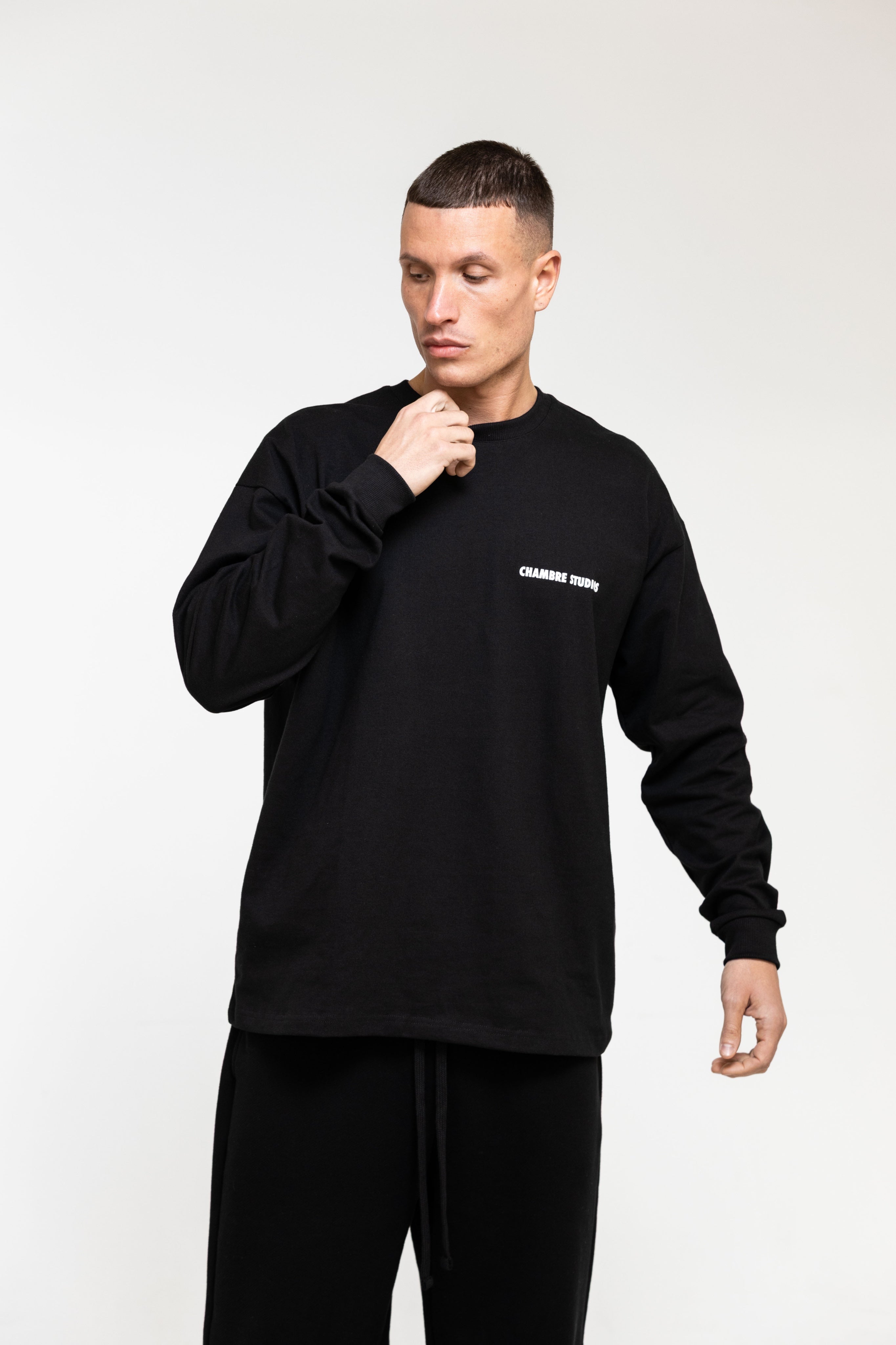 Heavyweight 330GSM black long-sleeve tee with a high-quality double-pressed screen print logo. Durable, structured and perfect for premium daily wear.